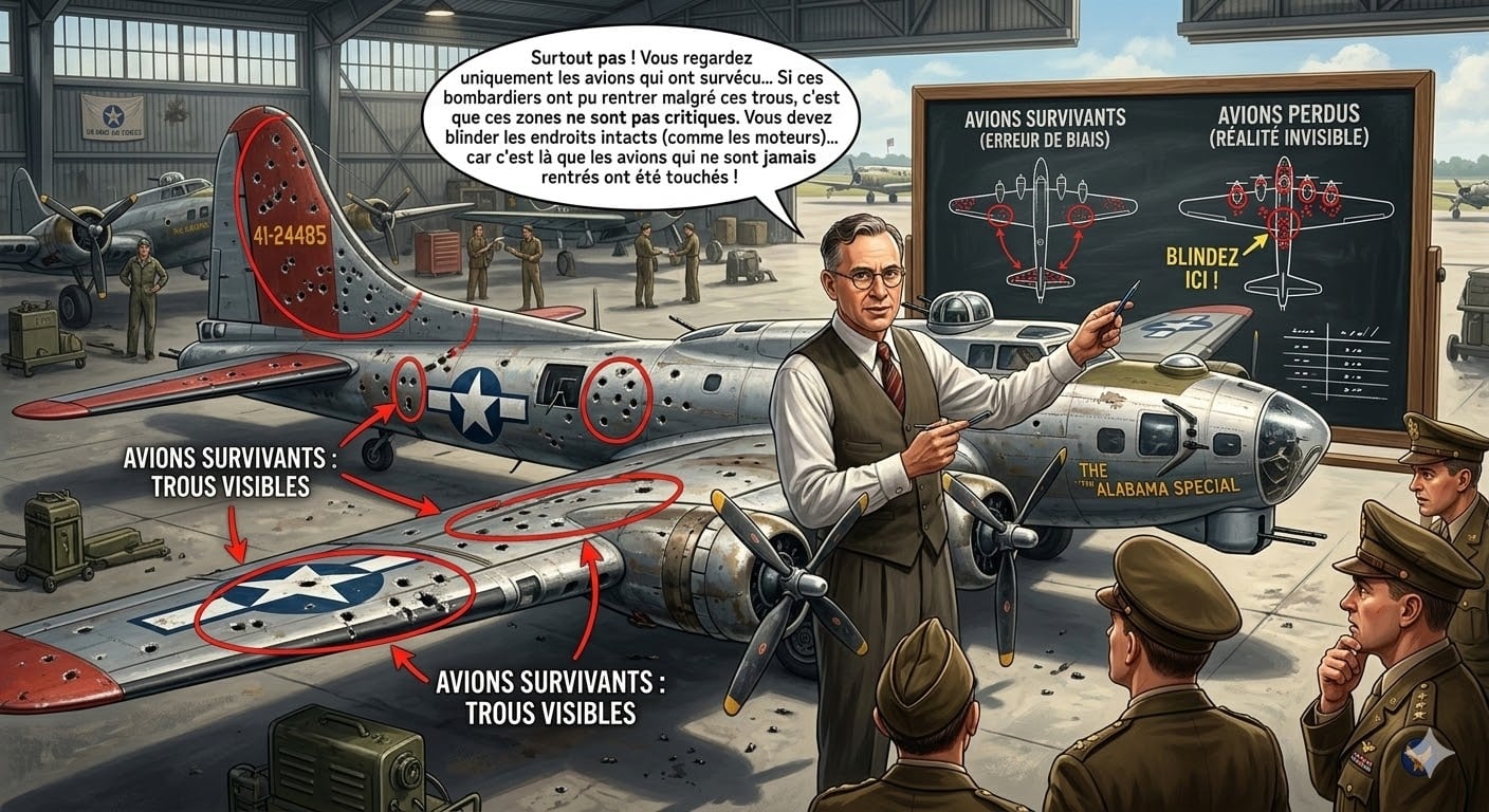 Jusqu’à ce qu’un brillant mathématicien, Abraham Wald, les arrête net : « Surtout pas ! Vous regardez uniquement les avions qui ont survécu. Si ces bombardiers ont pu rentrer malgré ces trous, c’est que ces zones ne sont pas critiques. Vous devez blinder les endroits intacts (comme les moteurs)… car c’est là que les avions qui ne sont jamais rentrés ont été touchés ! »