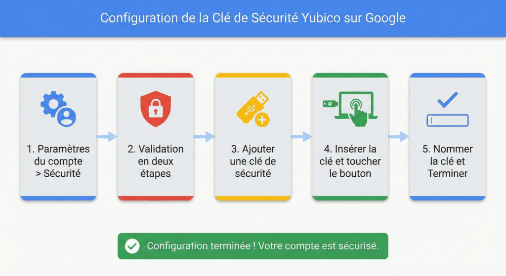 Associer une Yubico Security Key à votre Google Workspace (ou votre compte Gmail classique) est un jeu d’enfant. En la configurant comme méthode de validation en deux étapes (2FA) principale, vous blindez instantanément l’accès à vos e-mails, votre Google Drive et vos documents sensibles.