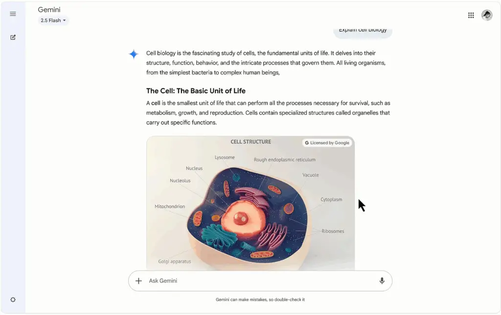 Pour faciliter encore plus la compréhension, Gemini intègre désormais automatiquement des images de haute qualité, des diagrammes et même des vidéos YouTube dans ses réponses. Cette richesse visuelle est particulièrement utile pour aborder des notions complexes comme la photosynthèse, la structure des cellules ou tout autre sujet demandant des illustrations.