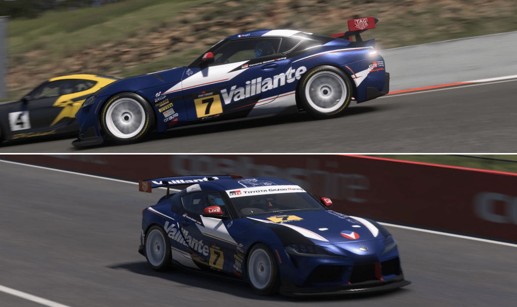 Michel Vaillant, c’est indissociable des courses d’endurance. Pour les catégories Gr.3 et Gr.4, j’ai trouvé ce superbe design (Toyota Supra Race Car ’19) présent dans la bibliothèque de livrée de Gran Turismo 7.