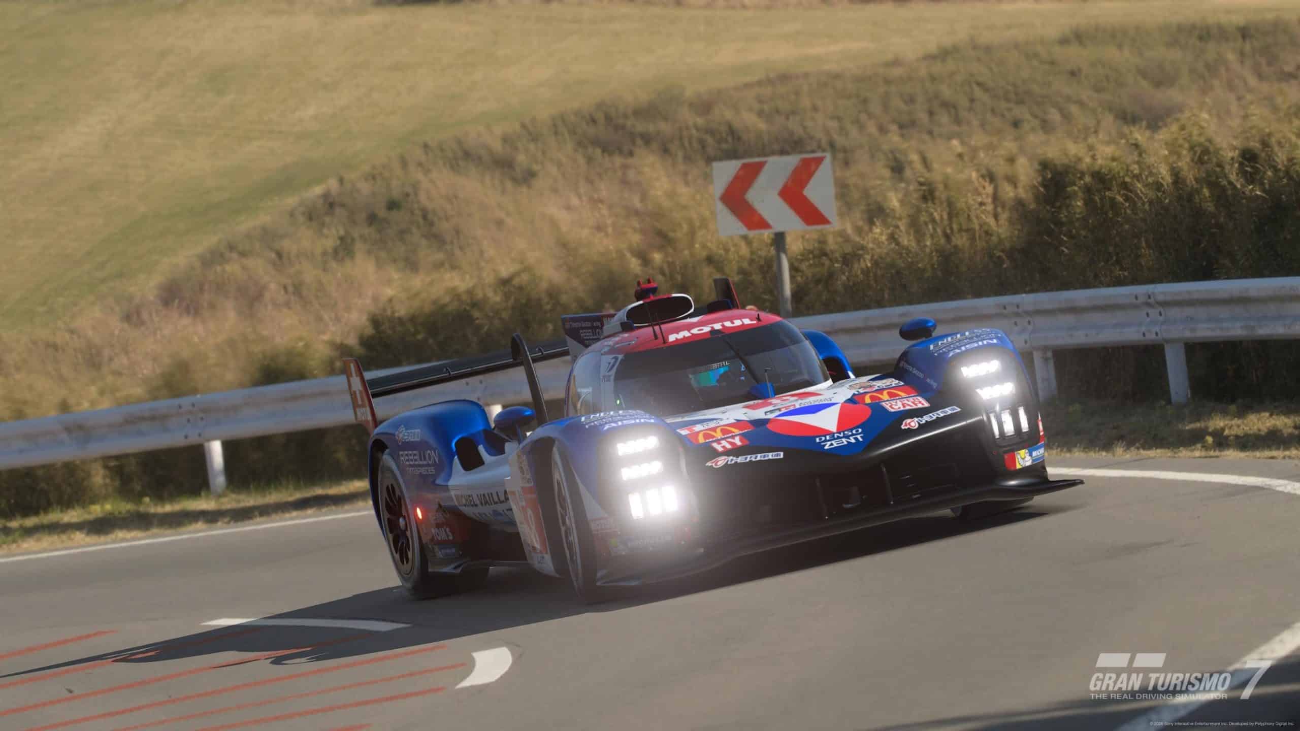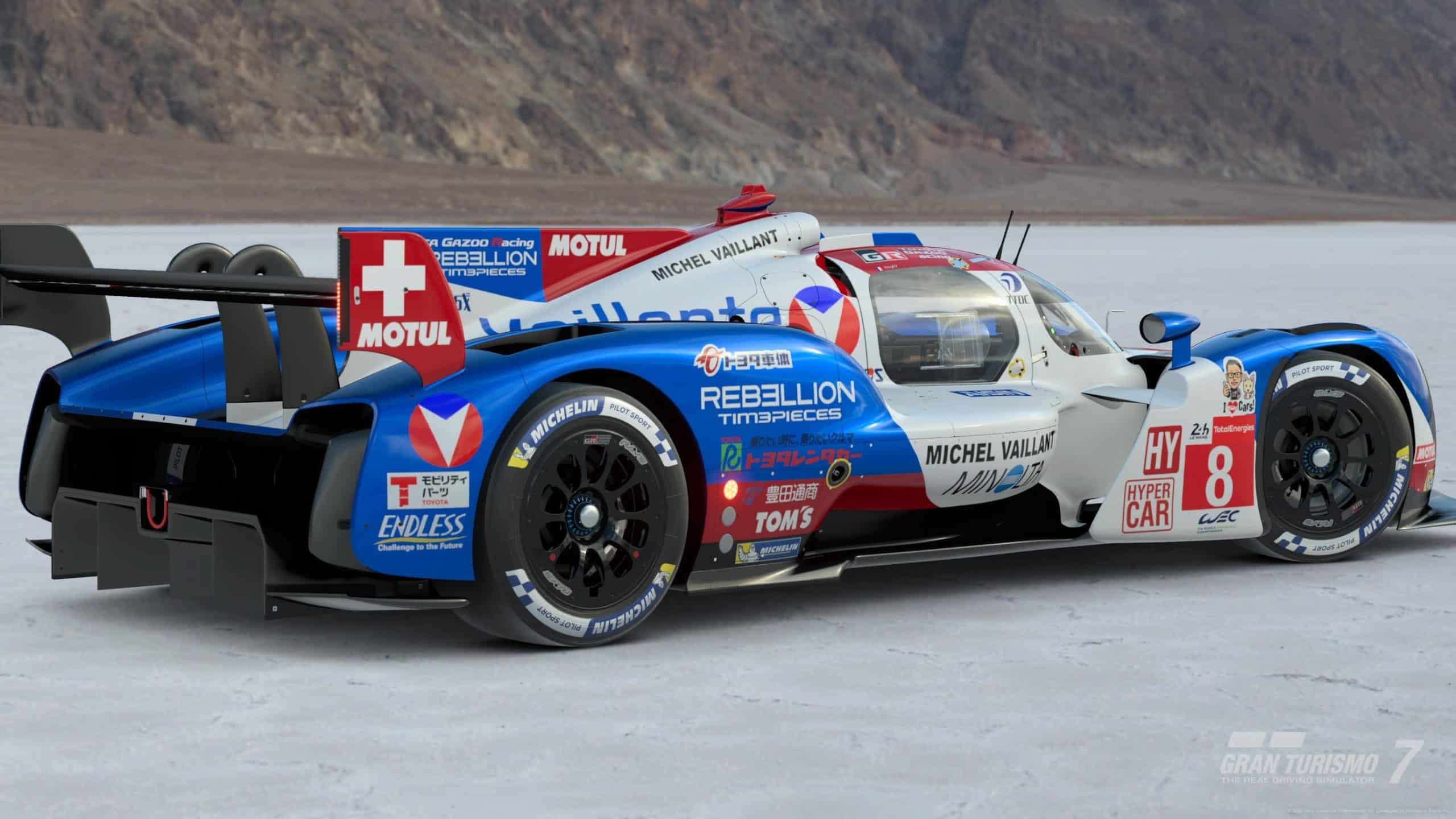 Si tu suis la Saison 2 de Michel Vaillant, tu sais que l’écurie s’est attaqué aux sommets de l’endurance moderne. J’ai notamment trouvé la livrée « Vaillante Rebellion » sur l’une des Hypercars les plus performantes de GT7 (Toyota GR010 Hybrid 21).