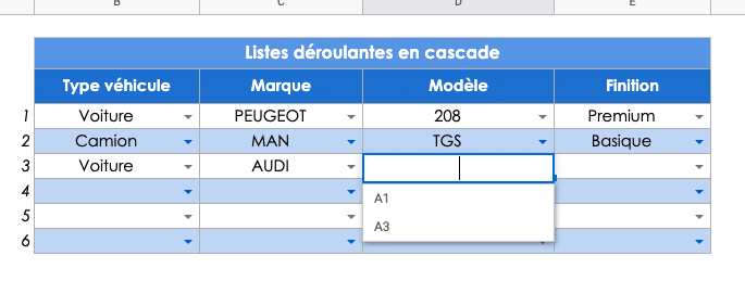 Ainsi pour ce faire, l’une des solutions est par exemple de créer un tableau dans lequel nous allons afficher les données attendues à partir desquelles nous allons pouvoir créer les listes déroulantes de niveau 2, 3 et 4 (Marque, Modèle, Finition).