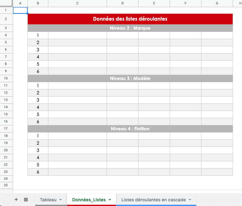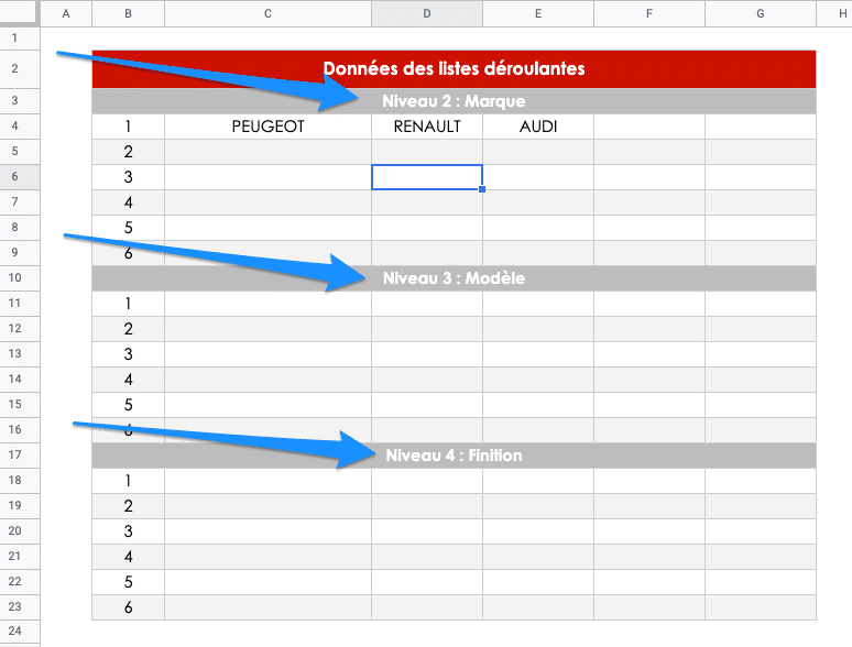 Comme vous pouvez le constater dans la copie d’écran de la feuille « Données_Listes », nous avons 3 niveaux (Marque, Modèle, Finition) composés de 6 lignes.