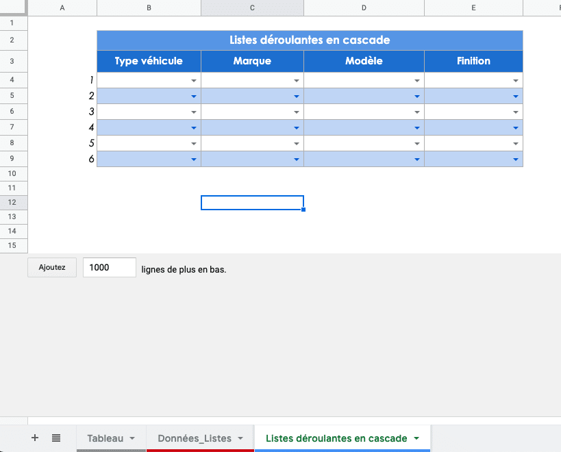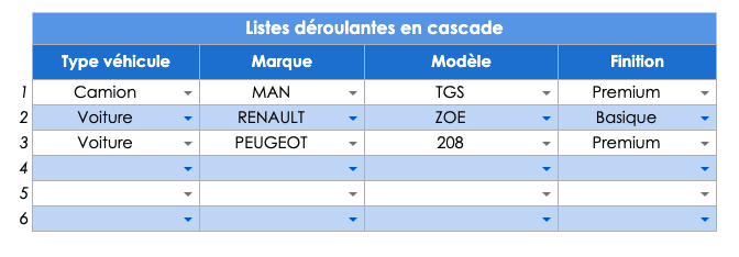 Le résultat attendu est donc d’obtenir un tableau avec les listes déroulantes en cascade comme ci-dessous :
