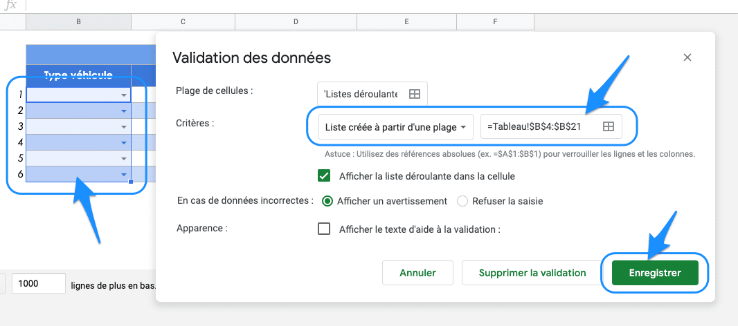 Le plus simple est ensuite de choisir comme critères « Liste créée à partir d’une plage » et de sélectionner les cellules concernées par le type de véhicule (B4:B21) dans la feuille « Tableau ».