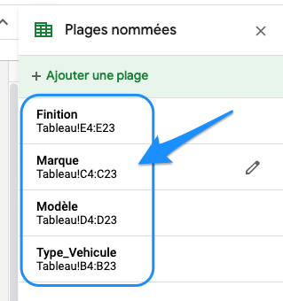Pour information, dans la fonction « FILTER », j’ai également utilisé la fonctionnalité de « plages nommées » pour que simplifier l’accès aux données de la feuille « Tableau ».