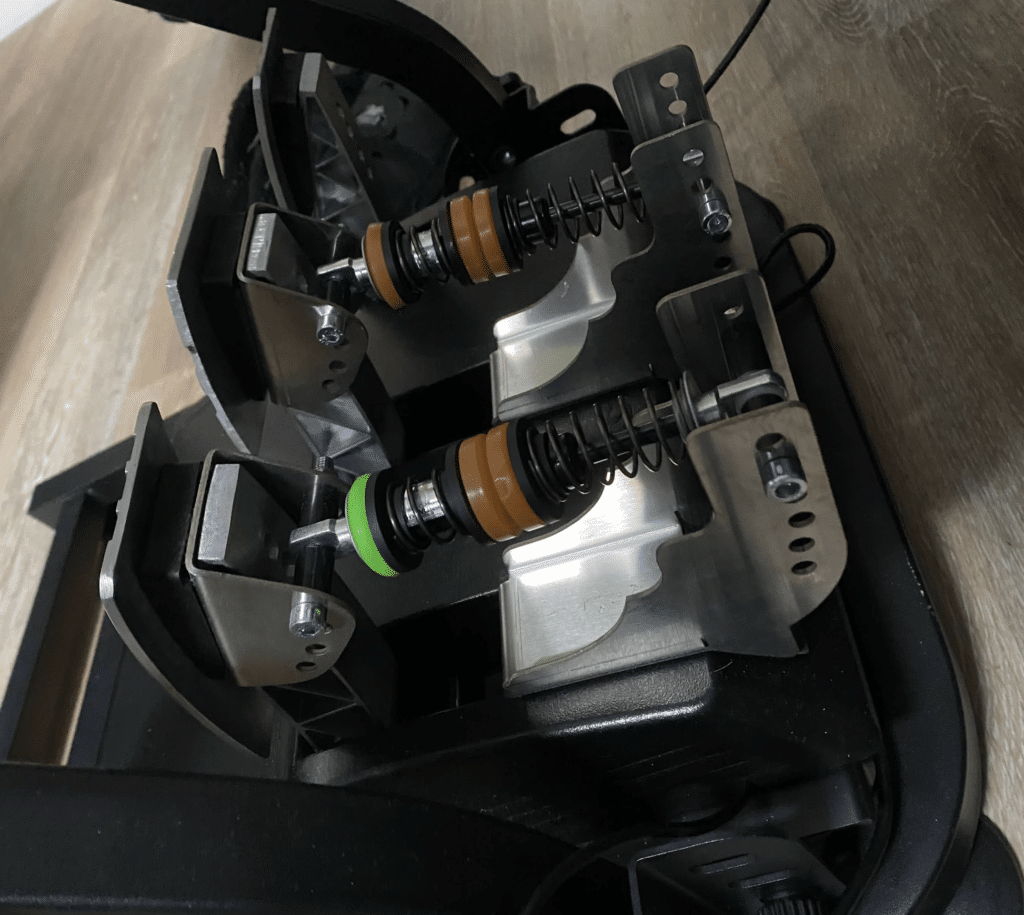 Il existe des petits « mods » (modifications) pour le pédalier, souvent vendus sur AliExpress ou des sites de simracing DIY. J’ai installé ce système (Accélérateur+Frein) pour ma part. Je vous confirme que ça améliore nettement les sensations au niveau de l’accélération et du freinage. Rien à voir avec le système par défaut.