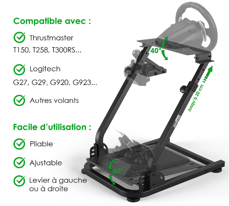 Enfin pour maintenir le volant le pédalier, etc.. Il y plusieurs possibilité. Mais je ne peux que vous recommander le Amstrad AMS-Race-Pilot. C’est le support que j’utilise en ce moment. Le rapport qualité-prix et très intéressant et surtout il est modulable. Top pour ranger tous l’équipement lorsque nous avons fini notre(nos) session(s) de SimRacing. 😄