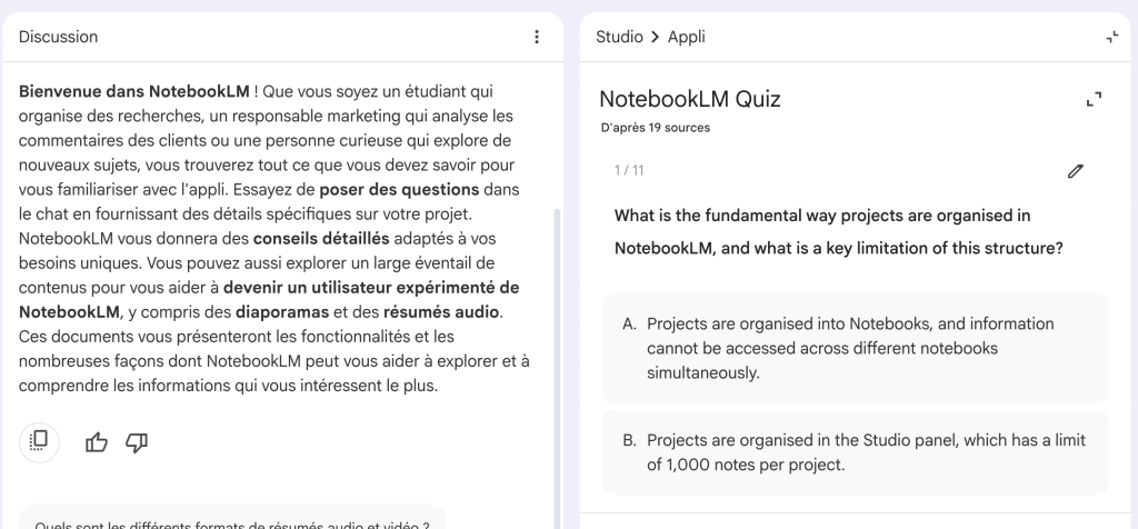 - ✅ Des Quiz et Flashcards : Idéal pour les étudiants qui révisent un examen. L’IA crée des questions pertinentes basées sur vos sources et vous aide à mémoriser les informations clés.