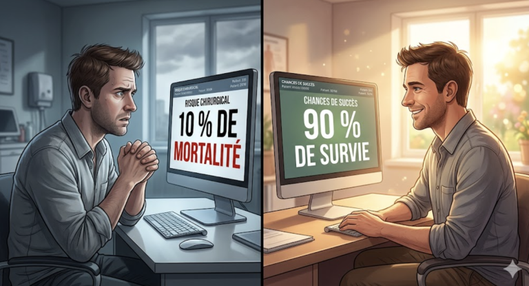 Imaginez que vous devez subir une opération chirurgicale délicate. Vous consultez deux médecins différents. Le premier vous regarde dans les yeux et vous dit : « Rassurez-vous, cette intervention a un taux de survie de 90 %. » Vous poussez un soupir de soulagement. Le second médecin, lui, vous annonce l’air grave : « Attention, il y a…